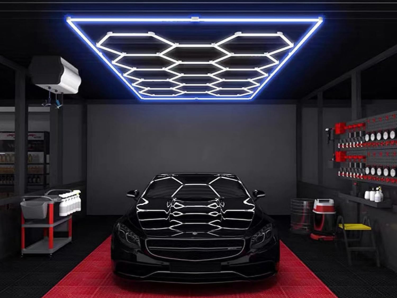 Our most popular and versatile hexagonal lighting kit with colorful boarder, such as blue, red, green, orange and purple. which is easy to assemble and can be hung or suspended to fit any garage, office, studio, or gym space. Made popular in the automotive and detailing industry, our lights are perfect if you’re looking for a luxurious and modern lighting solution while being very bright and functional.